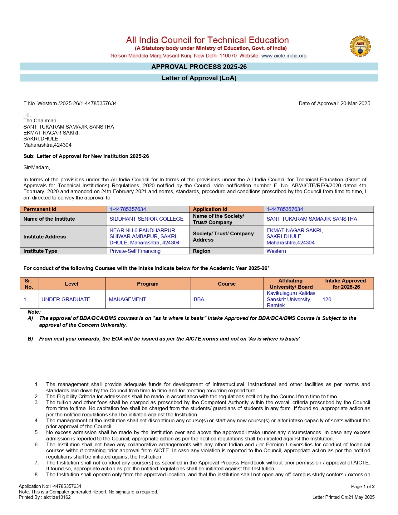 This approval allows the college to start BBA (Bachelor of Business Administration) from Academic Year 2025–26.